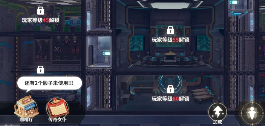 想要開啟養(yǎng)成類板塊的內(nèi)容,需要玩家將等級提升到5級以上且通過抽卡的方式獲得多個角色卡(角色卡越多越好),角色卡決定了能在科技大樓內(nèi)投放的角色數(shù)量。科技大樓內(nèi)有多個玩法內(nèi)容,伴隨玩家的等級來解鎖,作為初始5級的玩家只能在大樓中解鎖一個檔口,獲得一些屬性加成。咖啡館是開啟科技大樓的玩家都能體驗的玩法,咖啡廳玩法就是典型的大富翁玩法。