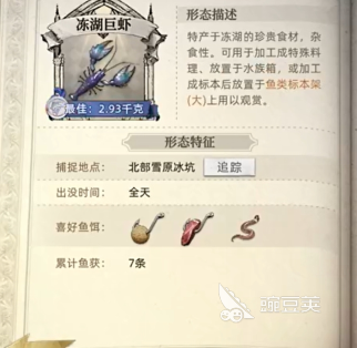 來(lái)到這里后打開(kāi)小地圖放大能看到一個(gè)藍(lán)色區(qū)域這里就是凍湖所在位置,之后到了這里后就能開(kāi)始捕捉了,捕捉的時(shí)候可以在生物記錄中查看它所喜歡的魚(yú)餌,利用這些魚(yú)餌釣它的話概率是非常高的,釣出來(lái)后后續(xù)可以進(jìn)行養(yǎng)殖。