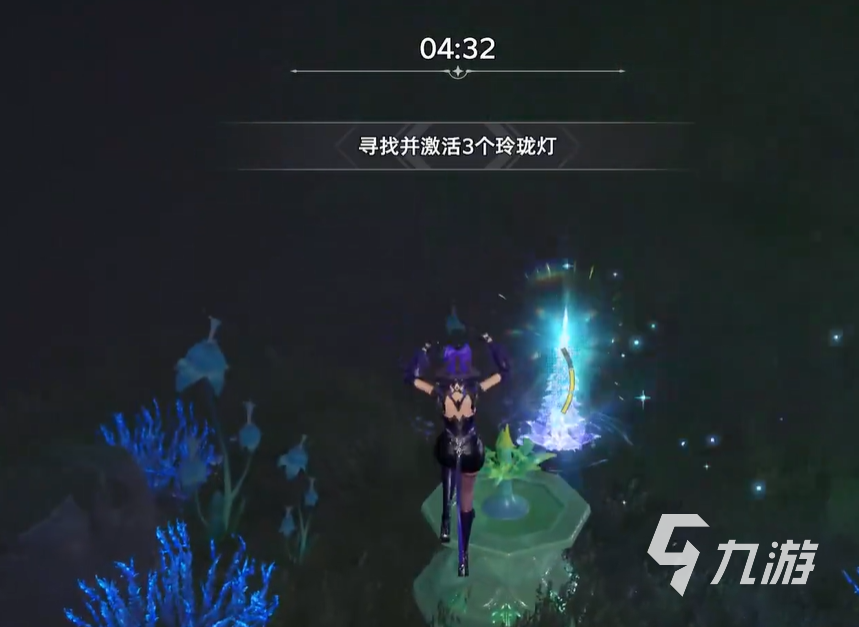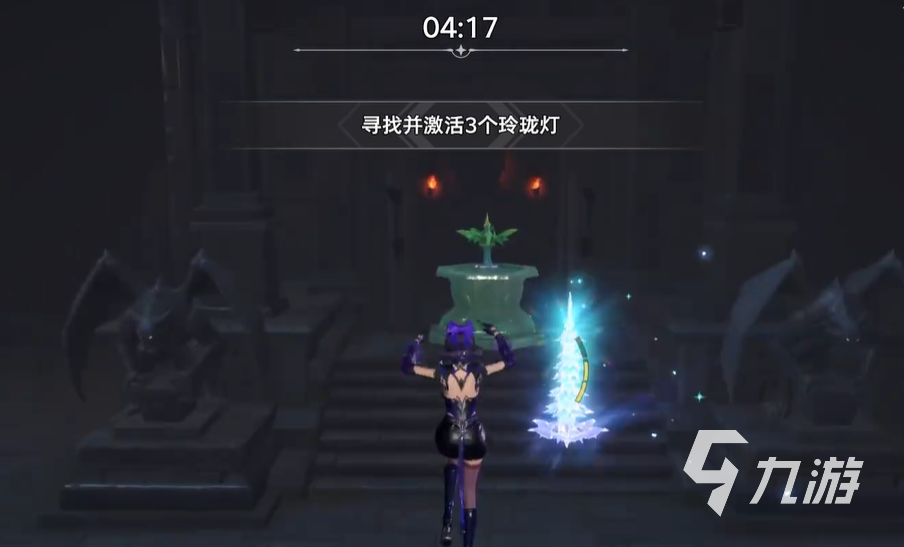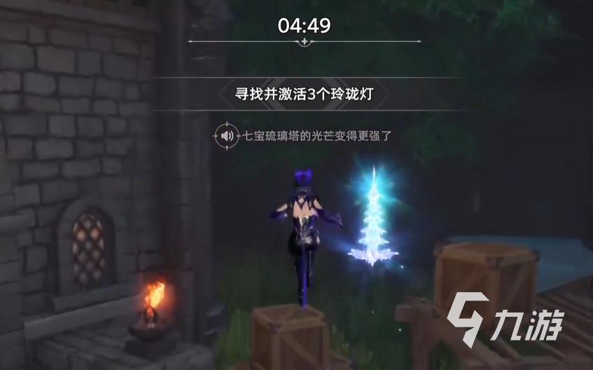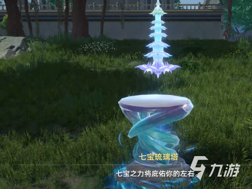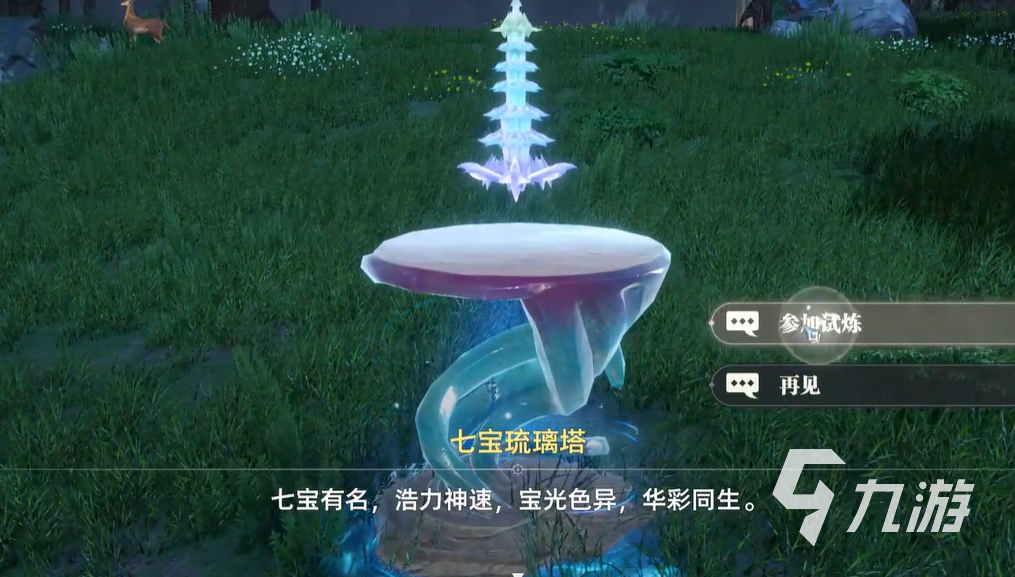 首先玩家們點擊草坪上的七寶塔,這時候就會跳出試煉選項,玩家們點擊以后就能正式開啟試煉,這個試煉的要求就是激活三個玲瓏塔,而此時玩家周圍會有一個比較明顯的玲瓏塔,這個玲瓏塔的作用就是照明以及指引方向,第一個玲瓏塔的方向在小屋的后面。