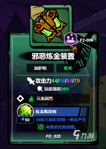 前期就能獲得的毒套核心武器,技能釋放毒霧打持續(xù)傷害,搭配能用壓力值釋放技能的魔能渦爐使用效果最佳。