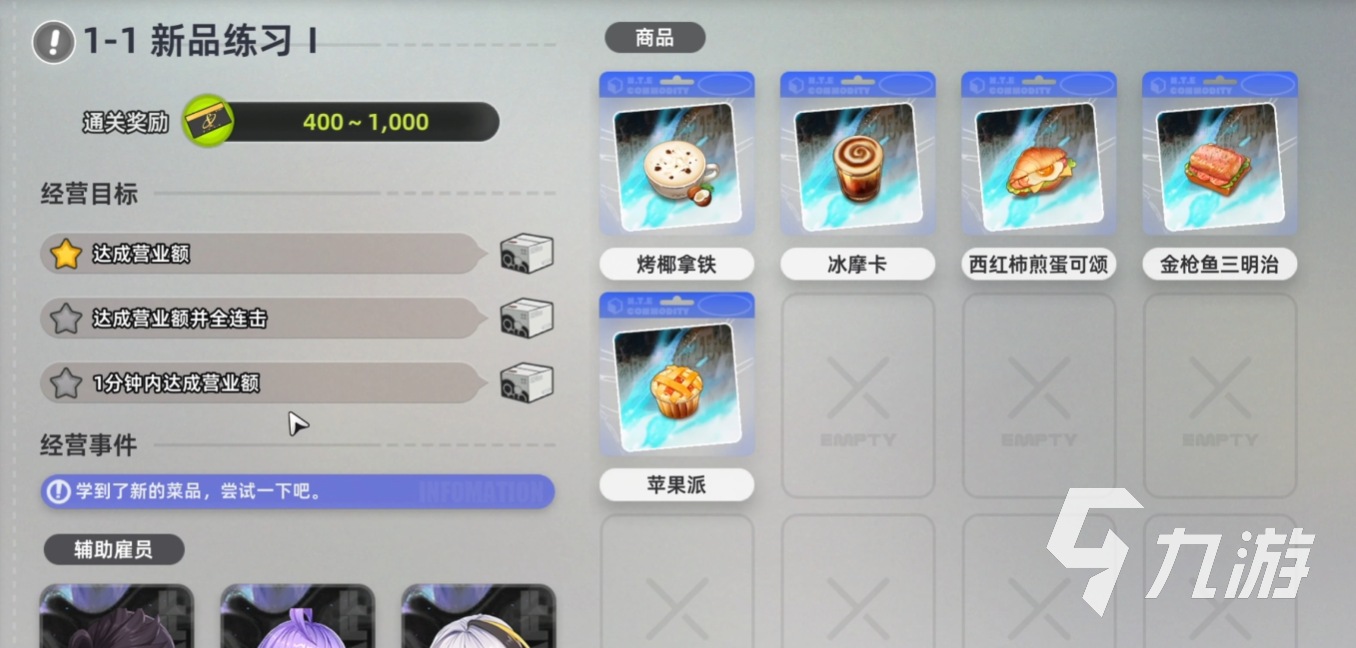 玩家可在店鋪管理界面查看當(dāng)前可制作的菜譜列表,包括咖啡、甜點、主食等多種類型,這時可利用好基礎(chǔ)菜譜,快速制作一些好做的東西。雇傭擁有特殊技能的員工(如提升食材處理效率或延長顧客等待時間)可優(yōu)化制作流程,幫助大家輕松制作美食。