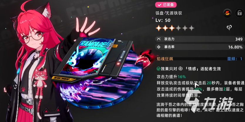 弧盤也就是武器,除了基礎的屬性外,還有技能效果,娜娜莉的話強烈推薦使用“無首鐵馭”,加攻擊力白值,加暴擊率百分比。而且擁有僅對情感適配者生效的效果“焰魂狂飆”,提升16%攻擊力,并且是釋放變軌攻擊或者極軌攻擊后的20秒內(nèi),普攻傷害提升20%,能疊2層,并且每一層的持續(xù)時間是單獨結算的。