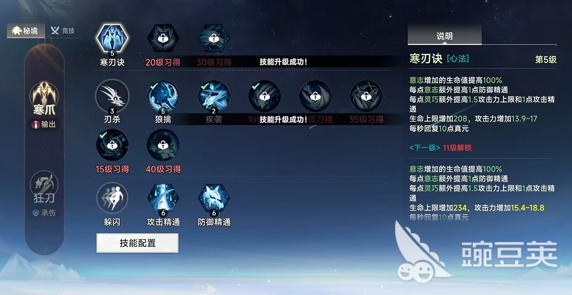 玩家選擇貪狼門派之后,可以修行兩種不同的心法,分別是寒爪和狂刀。寒爪心法是以利爪為武器,特點(diǎn)是身法迅捷,動(dòng)作靈敏,速度非??欤瑩碛休^強(qiáng)的殺傷力。擁有狼族血脈的寒爪弟子,可以帶來超乎尋常的敏捷和五官感受,在戰(zhàn)場(chǎng)上通過爪擊迅猛攻擊敵人。神出鬼沒,機(jī)動(dòng)性非常強(qiáng)悍,寒爪的心法追隨狼的天性和本能,在危急時(shí)候能夠爆發(fā)出很強(qiáng)的戰(zhàn)斗力。