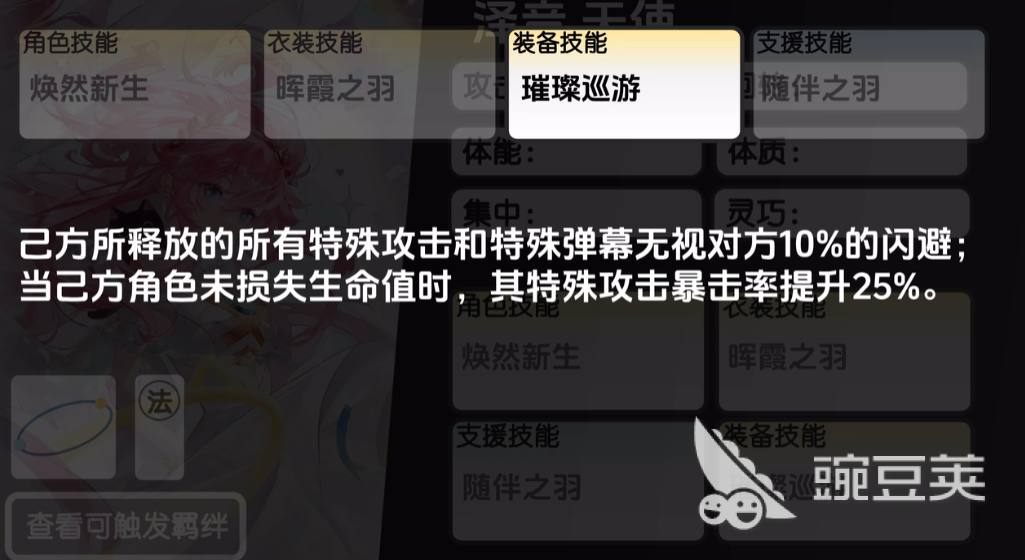 澤音的裝備技能可以選擇璀璨巡游,這個技能的效果會讓己方所釋放的所有特殊攻擊和特殊彈幕無視對方10%的閃避當己方角色未損失生命值時,帶來的特殊攻擊暴擊率提升25%,最后再支援技能上面澤音可以用的就是隨伴之羽這個技能,這個技能是當己方首次有角色生命值降低至一定百分比的時候,會為為這個角色回復(fù)其最大生命值的5%,當然這里生效的百分比還是比較多的,比如95%以及60%以下的時候可以觸發(fā),還有30%以及5%以下時也可以觸發(fā)這個回復(fù)效果。