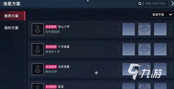 在“準(zhǔn)星通用”里還可以點(diǎn)擊右上角的“大神方案”,這里會(huì)有各式各樣的準(zhǔn)星方案供大家使用。無(wú)畏契約手游還有一個(gè)端游沒(méi)有的功能,就是可以調(diào)節(jié)準(zhǔn)星命中反饋,可以調(diào)節(jié)形狀、圖案。