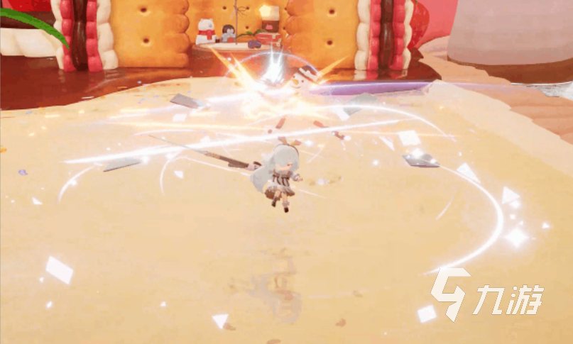 必殺技“圓謊之道”,橫向揮動(dòng)巨大的美工刀,生成氣浪攻擊,并推動(dòng)前方范圍內(nèi)的敵人,刀刃在觸碰到敵人時(shí),刀片會(huì)盡數(shù)破碎,并迸濺彈出,飛旋切割距離最近的目標(biāo),敵方遭受近戰(zhàn)斬?fù)魝Α?/p>