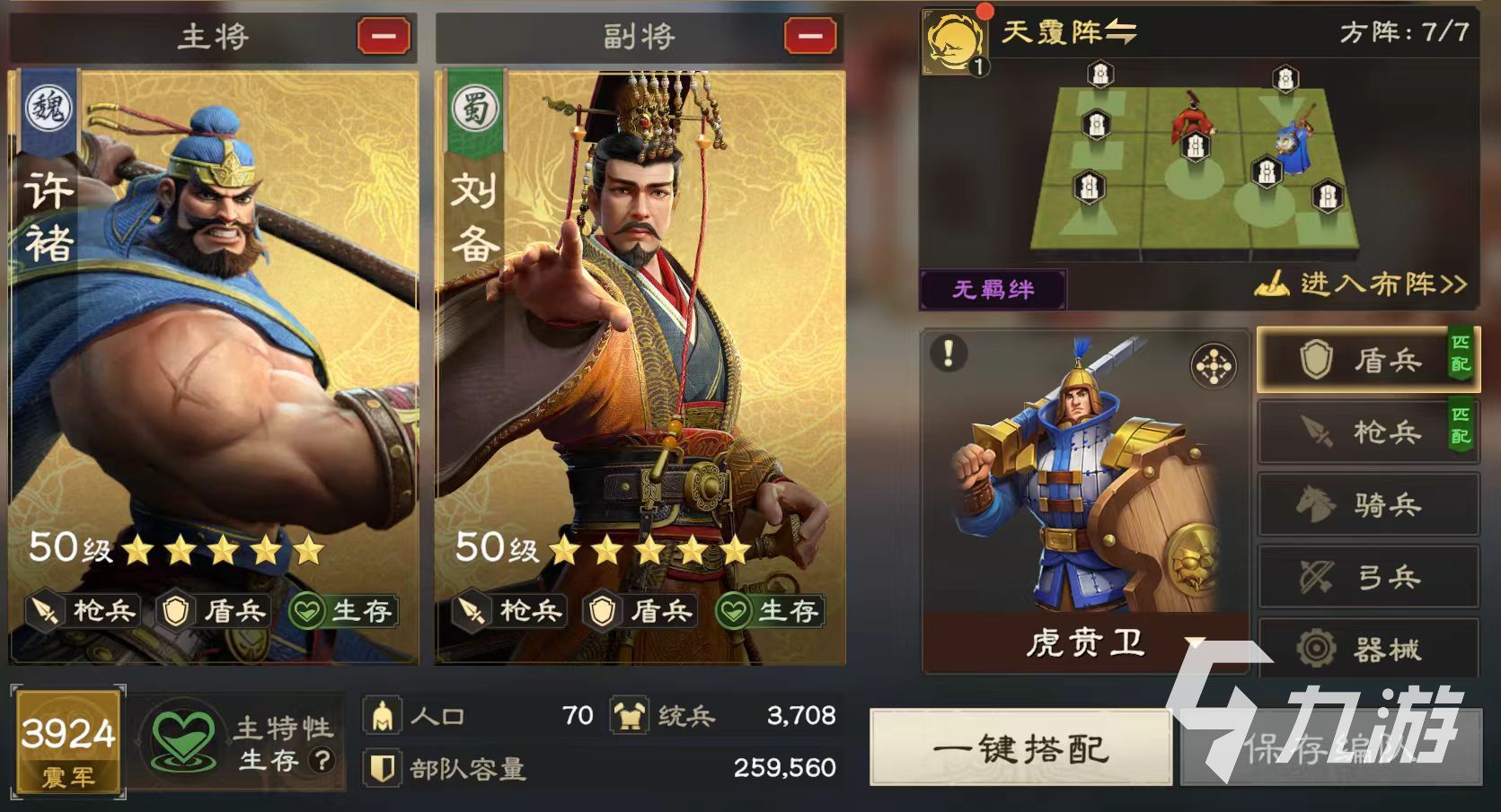 結(jié)合上面所說(shuō)的特殊兵種和游戲中的武將,如果想要玩盾兵隊(duì)伍,有以下幾種搭配方式。首先是生存盾,選擇的主將是許褚,副將是劉備,配備的兵種是虎賁衛(wèi),選擇陣法為天覆陣。這是第一賽季最推薦的盾兵組合方式,許褚技能可提升抗性加成,劉備也具有相似的效果,降低隊(duì)伍的普攻暴擊、技能暴擊所產(chǎn)生的傷害,使得整支隊(duì)伍的抗性非常高,可有效牽制對(duì)方打造的普攻和技能體系隊(duì)伍。