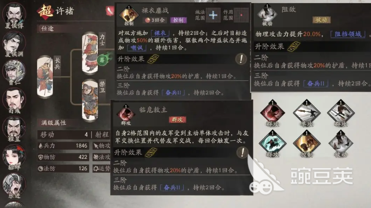 所以相對于泰山壓頂這個技能來說,是非常適合跟阻敵這類被動搭配在一起使用的,而他另外的軍功技能上面,可以選擇臨危救主,也就是在他自身兩格范圍之內(nèi)受到攻擊的時候,同樣是帶來一個換位的效果,額外在另外一個技能上面帶的就是推薦橫掃了,橫掃這個技能,可以對范圍之內(nèi)友軍的效果都帶來物攻80%的傷害,并擊退一個格子,所以相對來說,許諸在技能搭配上面,如果路線不一樣的話,搭配的技能效果也不一樣。