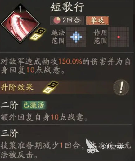 短歌行這個技能作為一個打攻的技能,在游戲當(dāng)中可以對敵軍造成物攻150%的傷害,此時給自身帶來的戰(zhàn)役恢復(fù)也達到了10點,作為一個遠程效果的技能,在上面是曹操的重要蹭傷手段,冷卻期上面是比較短的,但是傷害數(shù)值并不低,那么后期戰(zhàn)役恢復(fù)也可以讓他有了更多的頻率可以發(fā)動自己的戰(zhàn)法。