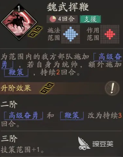 第二個技能是魏武揮鞭,這個技能相對來說就是支援性的效果,他可以給技能范圍之內(nèi)的我方友軍全部都剩下一個高級奮勇的效果,如果他目前是身為統(tǒng)帥定位的角色,那么曹操還會額外釋放一個鞭策的效果,持續(xù)兩個回合高級奮勇,是會為友軍帶來20%的攻擊提升效果,如果是鞭策狀態(tài)生效的話,那么他受到敵人的反擊時,傷害數(shù)值上面會減少35%的數(shù)值,相對曹操這樣的效果來說,其實任何的氪金度都會感受到他在輔助能力上面的強度,注意這里的高級分勇,其實效果主要是通用的增益,跟威震華夏這類覆蓋的相對來說不是疊加的能力,而鞭策的效果。