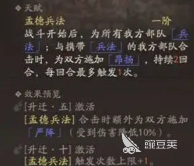 在游戲當(dāng)中,他的天賦叫做孟德兵法,只要跟曹操本人一起帶來合擊效果的話,他就可以觸發(fā)一個昂揚的效果,也是說實際上每一個回合,他除了給自身帶來昂揚的增益效果,還可以給敵人施加足夠的昂揚,但是他要搭配貂蟬跟嚴珩才能帶來此類效果,昂揚帶來的能力,基本就是造成的傷害數(shù)值上面會提升10%的能,。他在二階的情況下,減傷能力是非常明顯的,但是施加的目標(biāo)其實跟一階的限制效果是一樣的,那么他在技能上面可以用到的就是短歌行這個技能。
