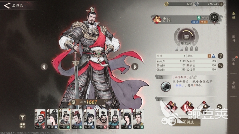 在這里的話,只要曹操為統(tǒng)帥可以觸發(fā)的效果還是有比較多的,所以大家在這里對輸出跟輔助是要做出選擇的,相對來說他的襲擾能力是更加適合在被動時間使用的,這個被動能力就是在他觸發(fā)一定主動攻擊的時候,可以將自己的物理攻擊提升8%,后期獲取繼續(xù)移動的能力,這里繼續(xù)移動是在回合結(jié)束之前可以利用自己剩余的移動力進行移動,當(dāng)然大家要注意,這里的繼續(xù)移動是在站位上面的移動,而不是行動回合上面的輸出,沒有輸出的移動次數(shù),只有定位上面的移動次數(shù)。
