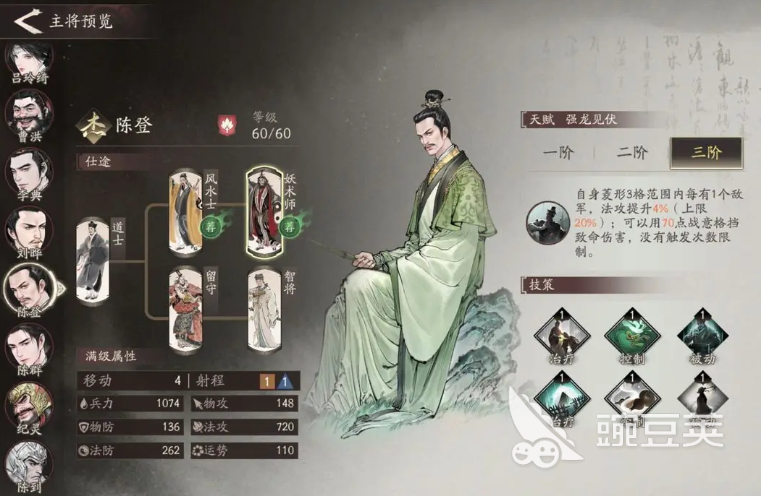 游戲當中的戰(zhàn)斗如果陳登作為主將上場的話,他可以增強自身的法強能力,而且對于法師效果來說,他的天賦能力其實也是比較苛刻的,他只有跟敵人維持了一定距離之后,才可以利用自身的戰(zhàn)意帶來足夠的輸出,雖然說他在戰(zhàn)意名刀的效果上面可以無限觸發(fā),但是,這個技能基本上在一個回合里面也只能觸發(fā)一次,所以他的保命技能其實基本都是靠天賦帶來的,他在天賦效果上面有足夠的機制之后,其實在戰(zhàn)斗上面的能力還是比較高的,這里如果走一個比較適合的路線,建議大家選擇法攻比較高的選擇妖術師就可以了。