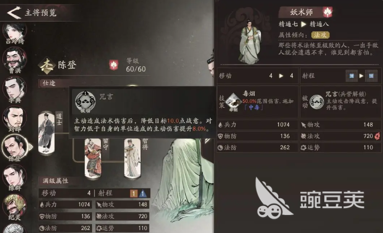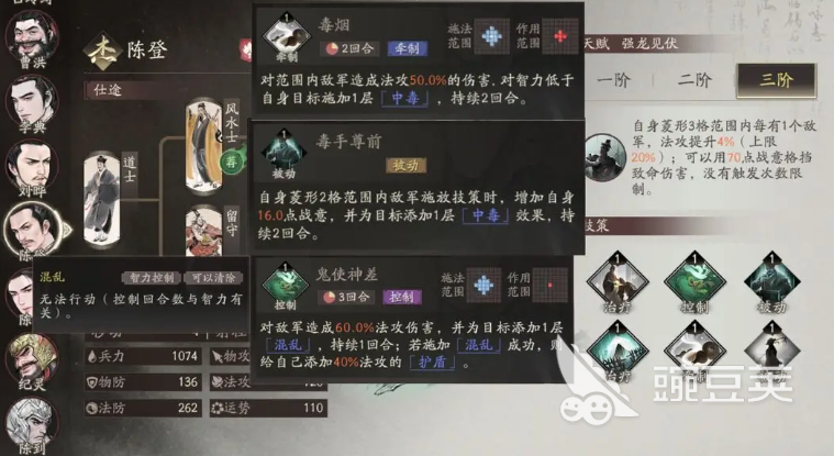 技能效果上面可以給他帶毒煙,鬼使神差以及毒手尊前這三個技能,毒煙技能其實是比較經(jīng)典的一個技能,他帶來的是常規(guī)的掛圖效果,但是使用的情況下,如果有一定缺陷的話,就是對上超品的武將在很大的概率上是不會生效的,因為他們有一些可以驅(qū)散的效果,所以這類中毒技能對于超品以下的武將來說,影響力才是比較大的,而鬼使神差對于這里陳登的效果來說,是一個中規(guī)中矩的技能,因為在上面帶來的主要是控制以及生存的能力,最強的技能還是他這里毒手尊前的能力。