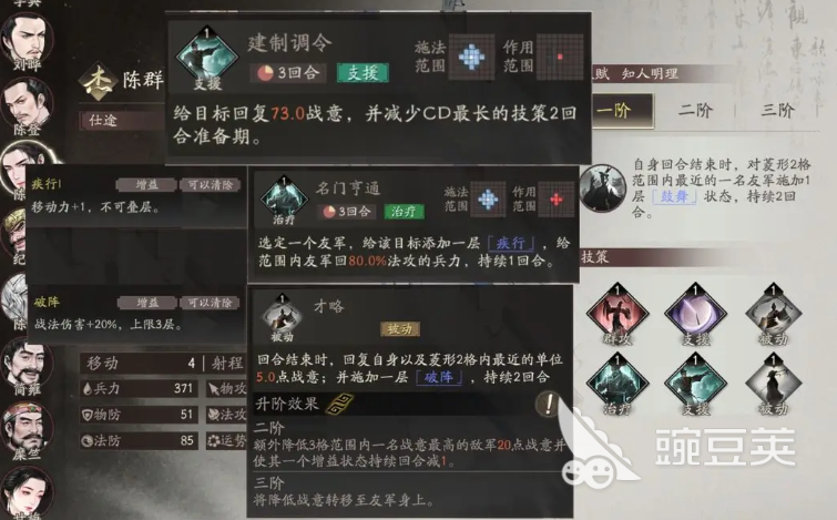 如果給他搭配其他武將的話,其實大家可以考慮的就是陳群,陳群他有一個建制調(diào)令的技能在其中,也是可以帶來免死效果的,所以跟陳登的這個免死是不會相互克制的,組建陣容的話,想要用好真盾的沖突機制,還可以在陣容里面配上一個肉盾,這樣的話真盾就可以利用肉盾的掩護來直接沖擊敵方陣型里面,當然,只要大家站在敵方的前排,其實中毒效果就足夠使用了,而且他可以達到原地放毒的影響機制。