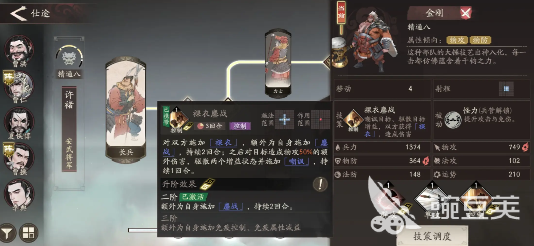 他的“泰山壓頂”會(huì)位移到選擇的空地上,對周圍一圈敵人造成50%傷害并擊退1格,對位移受到阻擋的敵人會(huì)施加上1回合眩暈,此招適合小地圖怪多和PVP環(huán)境能打出不錯(cuò)的控制,不過一樣建議升到二階解鎖護(hù)盾吧,不然容易被集火合擊,最后副將上建議去攜帶比較肉的,比方說戲志才和曹純。