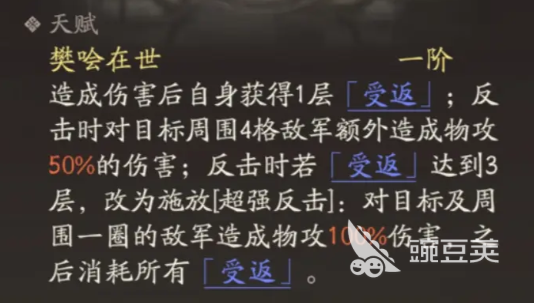 許褚的天賦是“樊噲?jiān)谑馈边@能在每次造成傷害時(shí),讓自身獲得1層受反,反擊時(shí)會(huì)對目標(biāo)周圍4格敵軍造成額外物攻50%傷害,反擊時(shí)若受反達(dá)到3層,會(huì)改成釋放出超強(qiáng)反擊,對目標(biāo)以及周圍一圈敵人都造成100%傷害。