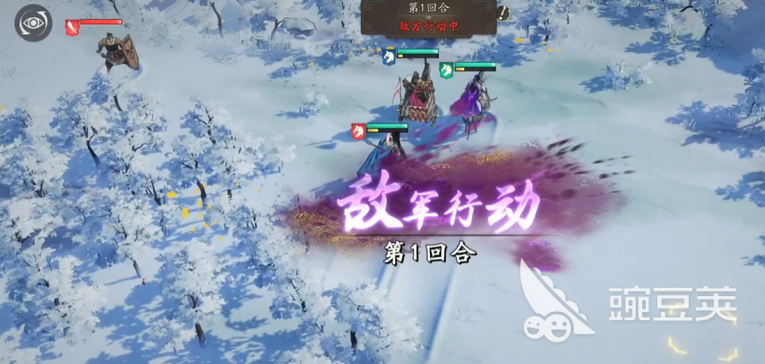 第一回合中先不用關(guān)羽來(lái)進(jìn)攻,繼續(xù)前進(jìn)讓關(guān)羽在戰(zhàn)斗狀態(tài)時(shí)再觸發(fā)再動(dòng)效果。之后開啟兵貴神速的技能,讓關(guān)羽到達(dá)城門口的兩個(gè)守衛(wèi)兵中間,此時(shí)一名守衛(wèi)會(huì)主動(dòng)繞后夾擊關(guān)羽,城中的敵人距離遠(yuǎn)還無(wú)法到達(dá)戰(zhàn)場(chǎng)。此時(shí)讓呂玲綺先和關(guān)羽合擊進(jìn)行兩次攻擊秒掉后方敵人,再讓張遼沖鋒也和關(guān)羽打出合擊秒掉另一名敵人。關(guān)羽再次前進(jìn)到達(dá)營(yíng)寨門口,與敵方大將展開戰(zhàn)斗。由于關(guān)羽的面板血量屬性高,因此可吸收敵方的集火傷害并且將其聚攏在附近,方便之后的合擊圍攻。