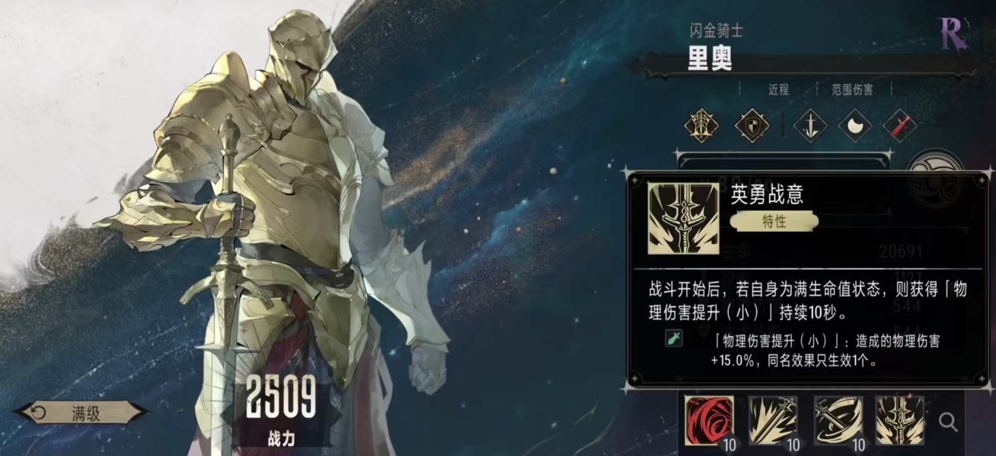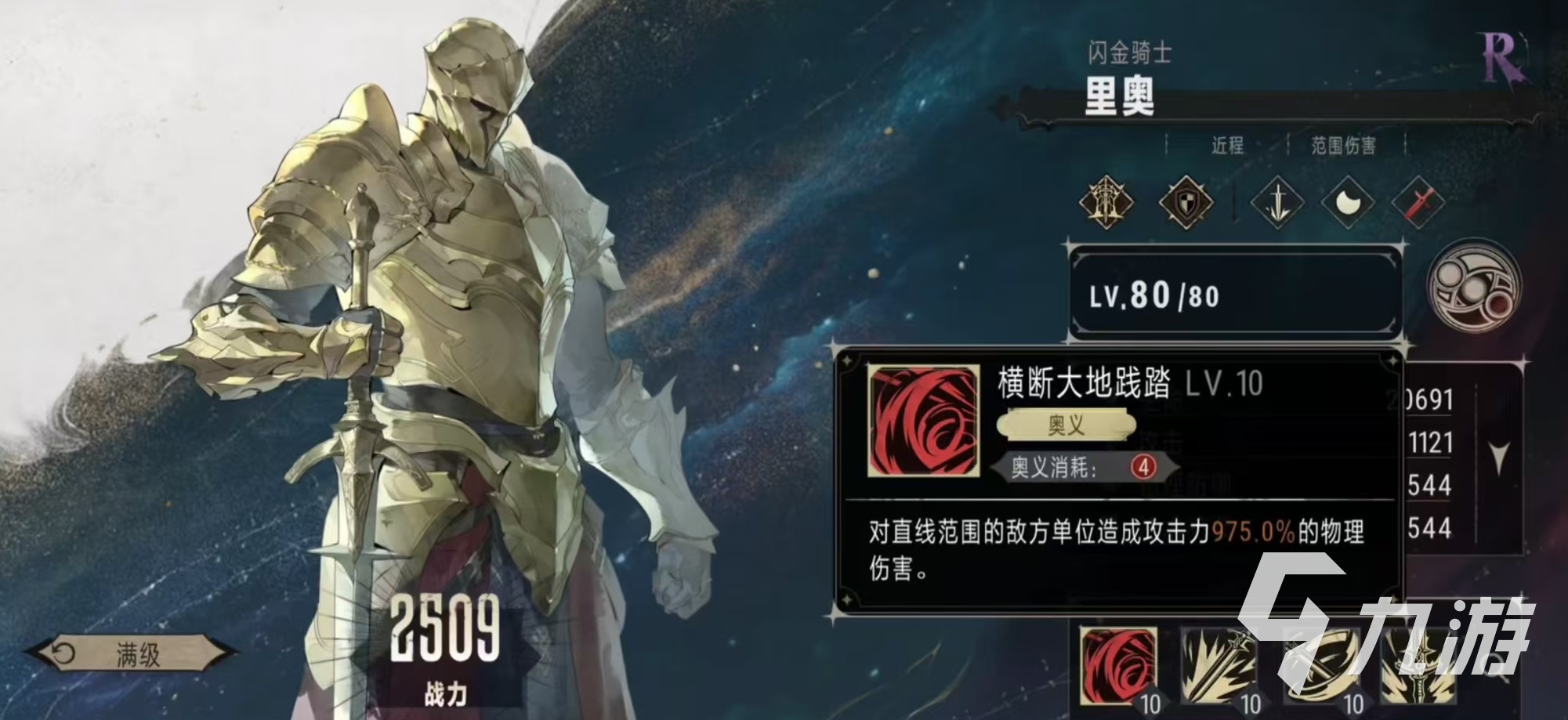 里奧的稱號是賞金騎士,自身在外觀方面還是有一定的戰(zhàn)斗力。在輸出方面是屬于近程類型的范圍傷害角色。和其他角色一樣,也是擁有4個技能值得大家去了解。首先是自身的奧義橫斷大地踐踏,對直線范圍內(nèi)的敵方單位造成975%的物理傷害,從傷害比率來看,還是比較可觀的,而且是直線范圍,所以輸出的目標也不算少。