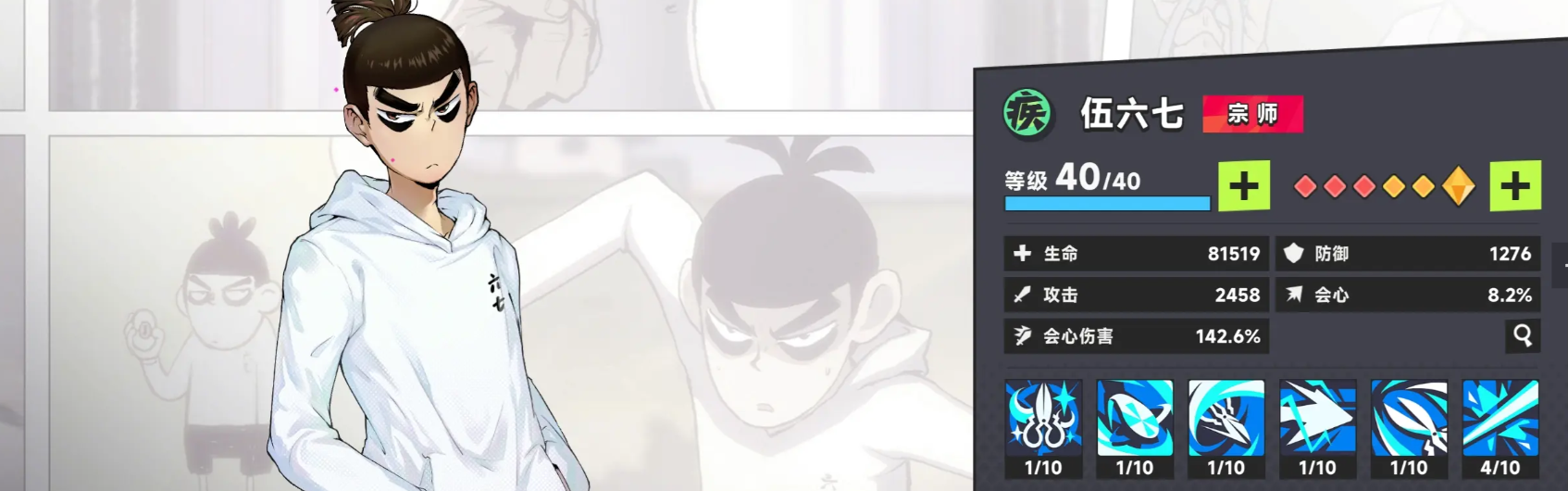 在角色的選擇方面,大家可能都更想選擇自己動(dòng)漫中喜歡的角色。不過(guò)小編這里推薦大家在新手期間可以使用伍六七來(lái)熟悉操作,因?yàn)槲榱卟粌H在動(dòng)漫中是主角,在游戲中同樣非常強(qiáng)力。其各項(xiàng)屬性都比較均衡,同時(shí)操作的難度比較低,對(duì)于新手玩家來(lái)說(shuō)比較好上手。等我們稍微熟悉了游戲的操作以及一些機(jī)制后,我們便可以開(kāi)始選擇我們自己喜歡的角色來(lái)戰(zhàn)斗了。除了戰(zhàn)斗外,玩家還可以在伍六七暗影交鋒體驗(yàn)到經(jīng)營(yíng)的快感,玩家可以經(jīng)營(yíng)起自己的發(fā)廊和牛雜店,經(jīng)營(yíng)的同時(shí)為我們提供一定的物資。