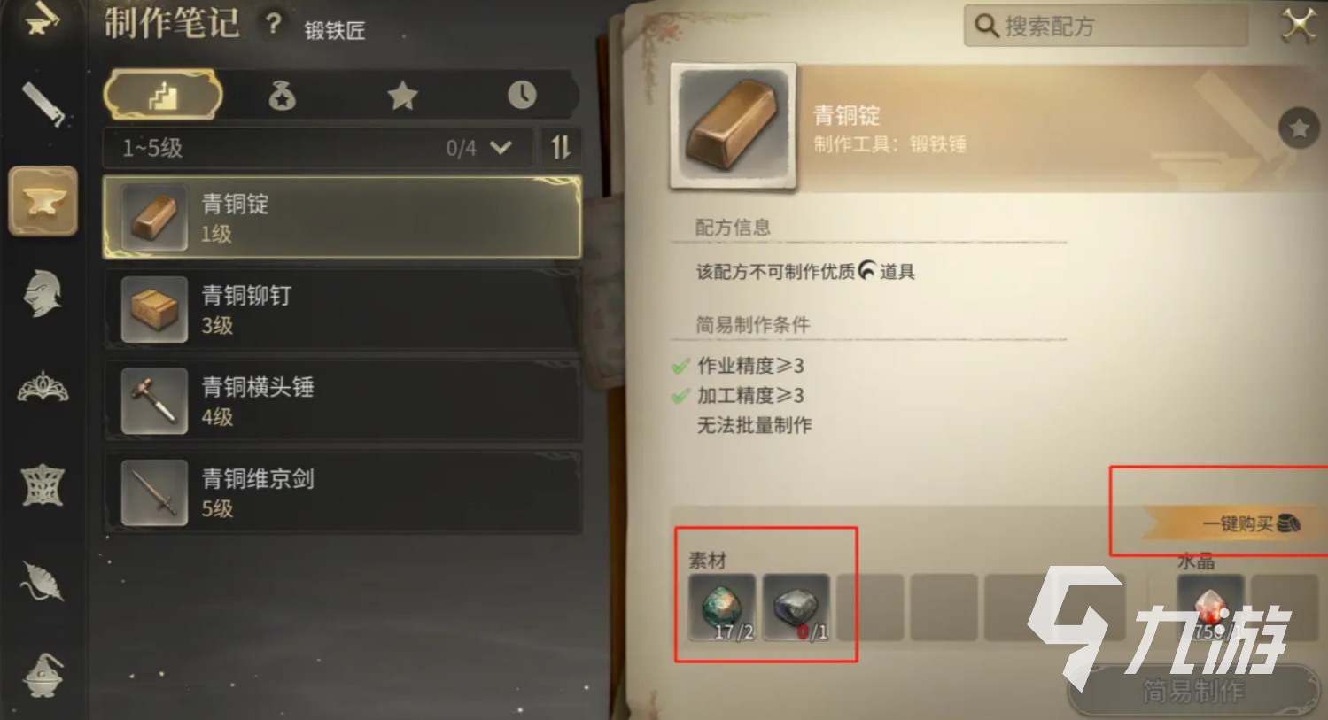 首先是1-15級,也就是新手階段;這時可制作基礎(chǔ)裝備(如銅錠、銅鉚釘),材料可在主城商人處購買。接著大家再重復制作,積累經(jīng)驗,15級后可解鎖黑鐵錠和黑鐵鉚釘配方。后面就要準備更高級的材料了,可獲得更多經(jīng)驗。