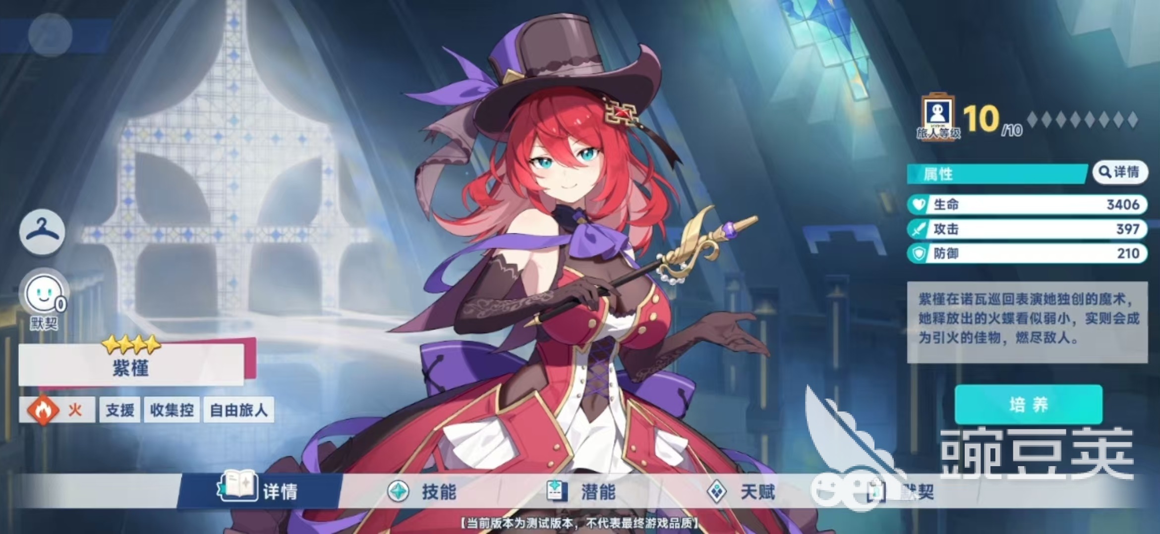 先來(lái)看一下普通攻擊,生成火鳥對(duì)敵方造成多次火系傷害。主控技能效果是扔出頭上的魔術(shù)帽,每0.5秒鐘可以對(duì)目標(biāo)造成一次火系傷害,并附加火系印記,持續(xù)5秒鐘,釋放技能時(shí),全隊(duì)的攻擊力都能獲得提升效果。援護(hù)技能效果是生成三只沐蝶和三只炎蝶,分別作用于場(chǎng)上的主控角色和輸出目標(biāo)。沐蝶可以提升主控角色的暴擊傷害。每只沐蝶額外提升主控角色的暴擊。炎蝶對(duì)目標(biāo)造成火系傷害,并附加一層蝶之印和一層火系印記。