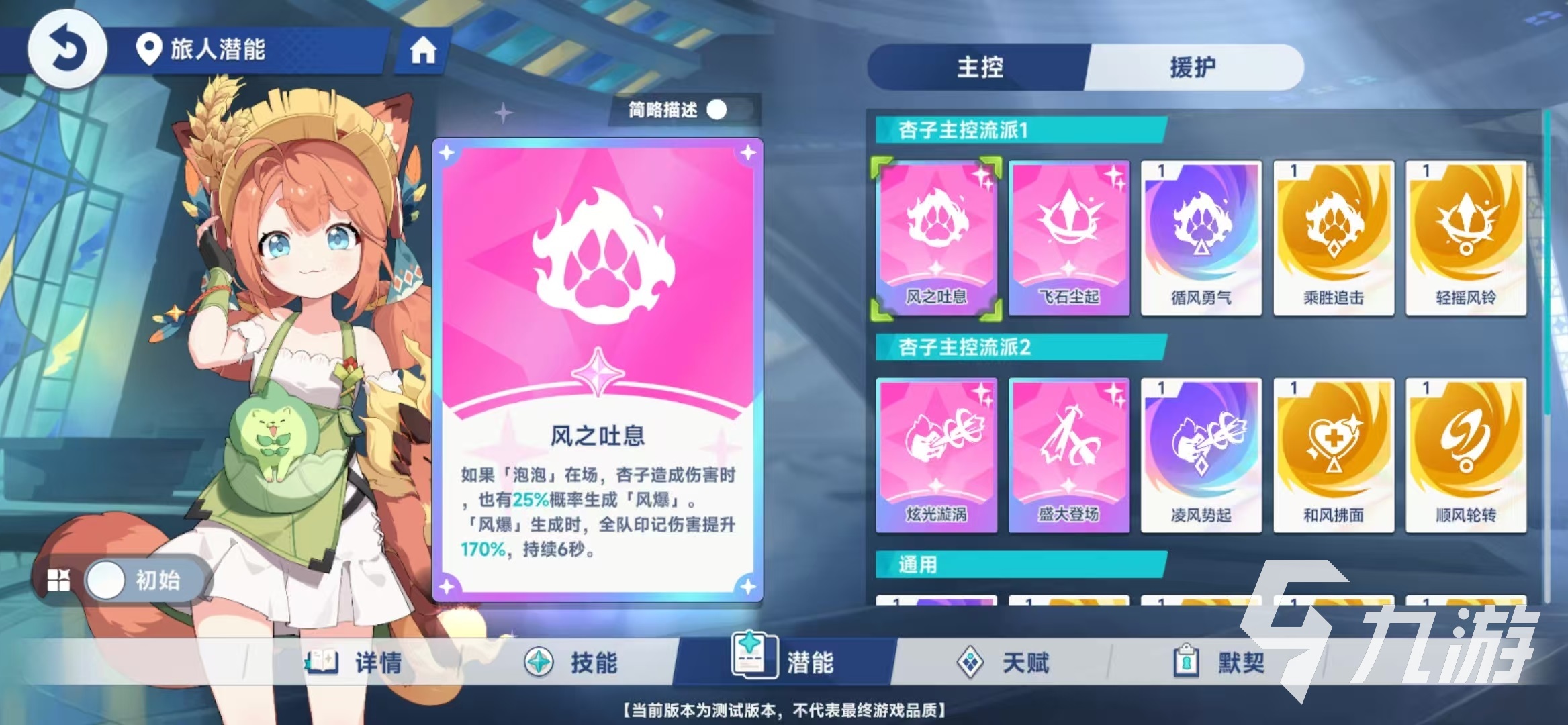 杏子這個(gè)角色一般都是和風(fēng)系的其他角色一起組成陣容,而且自身并不會(huì)作為主控,而是作為援護(hù)登場(chǎng),因?yàn)橹灰煤蔑L(fēng)墻就足夠了,風(fēng)墻才是杏子的真正核心所在。不僅可以阻擋大量傷害,在杏子退場(chǎng)之后,風(fēng)墻也能在場(chǎng)中持續(xù)生效。這樣一來(lái),這個(gè)輔助角色就可以在全場(chǎng)發(fā)揮出很重要的作用。潛能方面,建議選擇風(fēng)之吐息、飛石塵起、循風(fēng)勇氣、乘勝追擊、輕搖風(fēng)鈴等。例如風(fēng)之吐息,泡泡在場(chǎng)的時(shí)候就能使得杏子的傷害有幾率產(chǎn)生風(fēng)爆,以及在風(fēng)爆炸時(shí)提升全隊(duì)的印記傷害等。