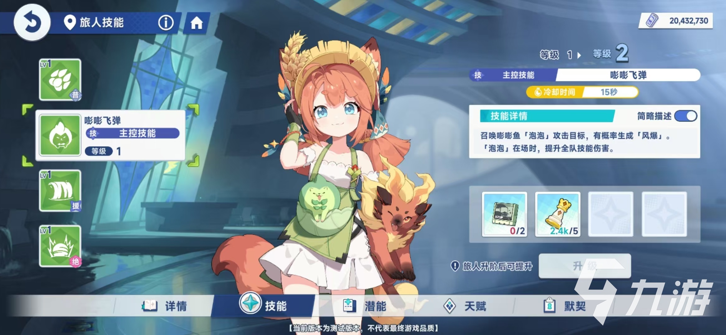 杏子是屬于風(fēng)屬性的支援型角色,在技能方面,普攻技能伶牙俐齒,召喚出火狼對(duì)目標(biāo)進(jìn)行連續(xù)撲咬,造成風(fēng)系傷害。主控技能嘭嘭飛彈,召喚出嘭嘭魚(yú)泡泡,噴射出飛彈造成風(fēng)系仆從傷害。召喚出來(lái)的泡泡擁有杏子100%的攻擊力,存在15秒鐘。泡泡造成傷害時(shí),有25%的幾率生成風(fēng)暴,造成風(fēng)系仆從傷害,并附加風(fēng)系印記。該效果每秒鐘最多觸發(fā)一次。當(dāng)泡泡在場(chǎng)上的時(shí)候,全隊(duì)技能傷害有額外加成。