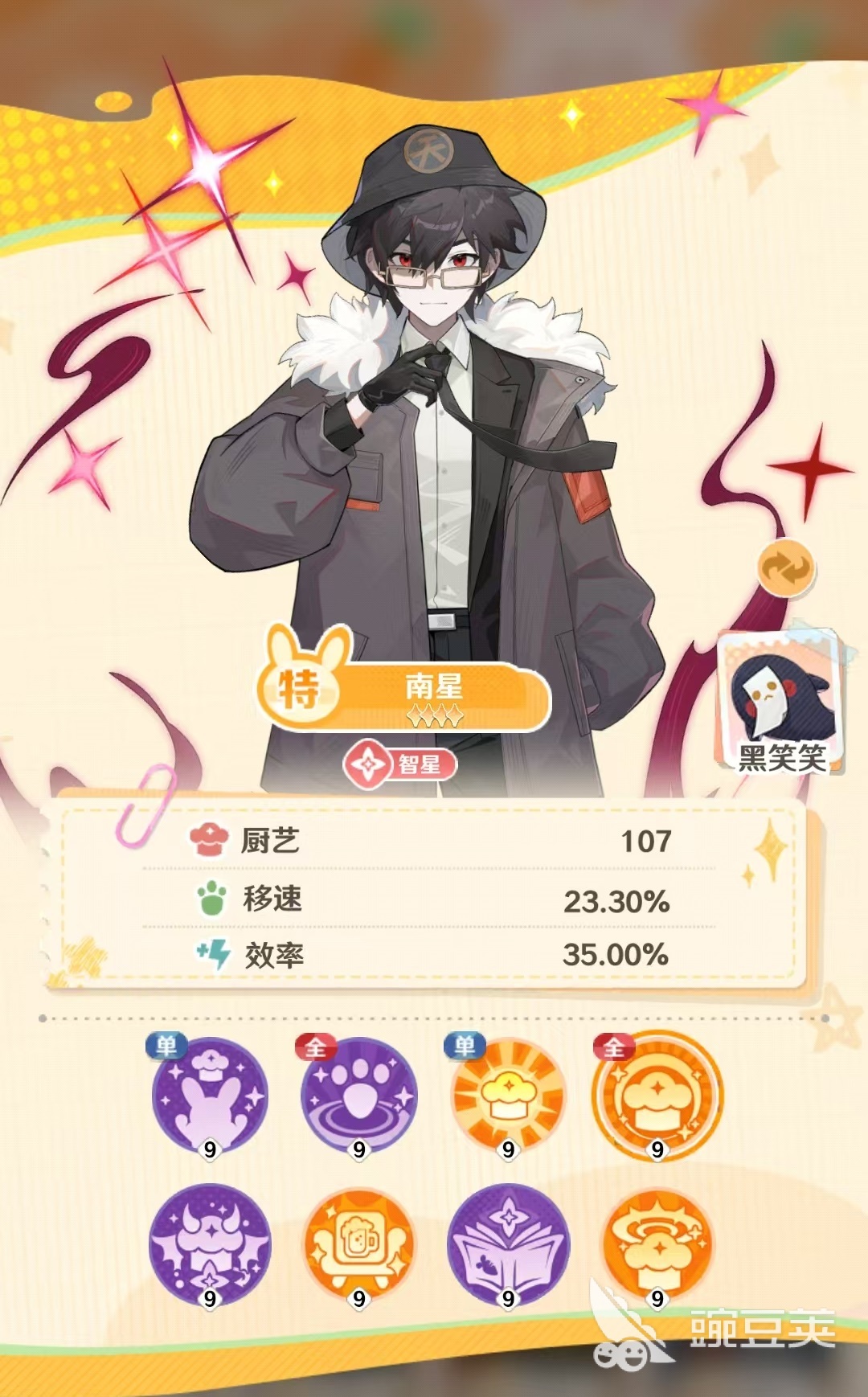 南星的伴生靈是黑笑笑,在升到12星時可以解鎖,是一個誠實的小幽靈,也是南星老師給他送的禮物。在平時可以陪伴著一起行走,還可以扮演成一個照相機。在技能方面,第1個技能廚力全開,在店鋪中制餐的時候,自身廚藝能夠增加13%,只要在工作就能生效。第2個技能移速共鳴,在經(jīng)營店鋪的時候,店鋪中所有店員的移動速度增加3%。