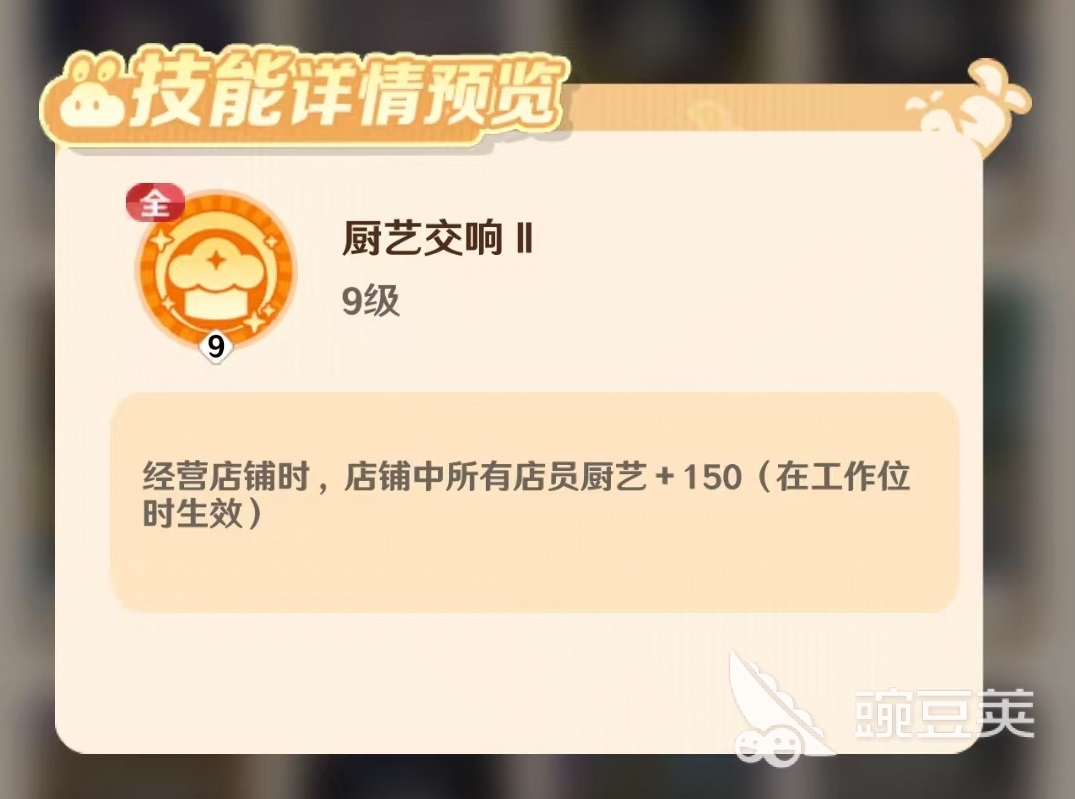 在技能方面,皮皮擁有兩個單體技能和兩個全體技能。第1個單體技能是在店鋪中聚餐的時候可以增加13%的自身廚藝,這個技能只有在工作會的時候才會生效。大家可以點擊電源,然后選擇工作位,只有將皮皮派駐到上方之后,才能夠發(fā)揮出此技能的優(yōu)勢。