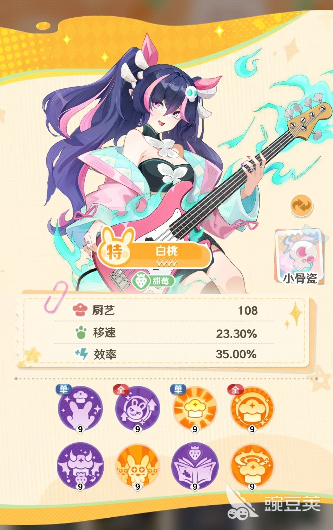 白桃外觀甜美可愛,使用一把吉他,自身是屬于甜莓特質(zhì)的店員,熱情而可愛,所攜帶的伴生靈是小骨詞,是一個(gè)骨精靈形象,可以幻化成琴,在進(jìn)行交互的時(shí)候有著很好的待機(jī)動作。技能方面,核心技能包括兩個(gè)可以提升全體店員效果的技能,以及兩個(gè)對自身生效的單體技能。