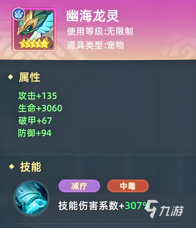 幽海龍靈是大家在寵物招募過程中可以直接抽取到的MR級(jí)別寵物,當(dāng)然概率方面比較低,需要很好的運(yùn)氣才可以抽到。它的技能是深海怒殺,屬于主動(dòng)類型,效果是在戰(zhàn)斗中對(duì)三個(gè)目標(biāo)造成傷害,并給目標(biāo)施加減療效果目標(biāo),下次受到治療時(shí),治療效果會(huì)下降25%。還可以給目標(biāo)施加中毒效果,對(duì)方中毒之后每秒鐘按照生命上限2%去減少血量,持續(xù)6秒鐘,冷卻時(shí)間40秒。