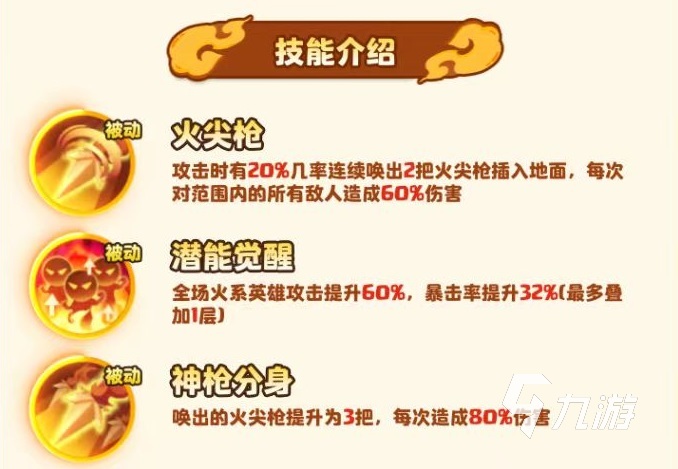 所以赤焰魔童并不等于哪咤,這一點(diǎn)大家要記住。在技能方面,三個(gè)被動(dòng)分別是火尖槍、潛能覺醒和神槍分身?;鸺鈽尩男Ч窃谶M(jìn)行攻擊時(shí),有20%的幾率,連續(xù)召喚出兩把火尖槍插入地面。每次都能夠?qū)Ψ秶鷥?nèi)的敵人造成60%的傷害。潛能覺醒使得場(chǎng)上的火系英雄攻擊力提升60%,暴擊率提升32%,這個(gè)效果不可以疊加。