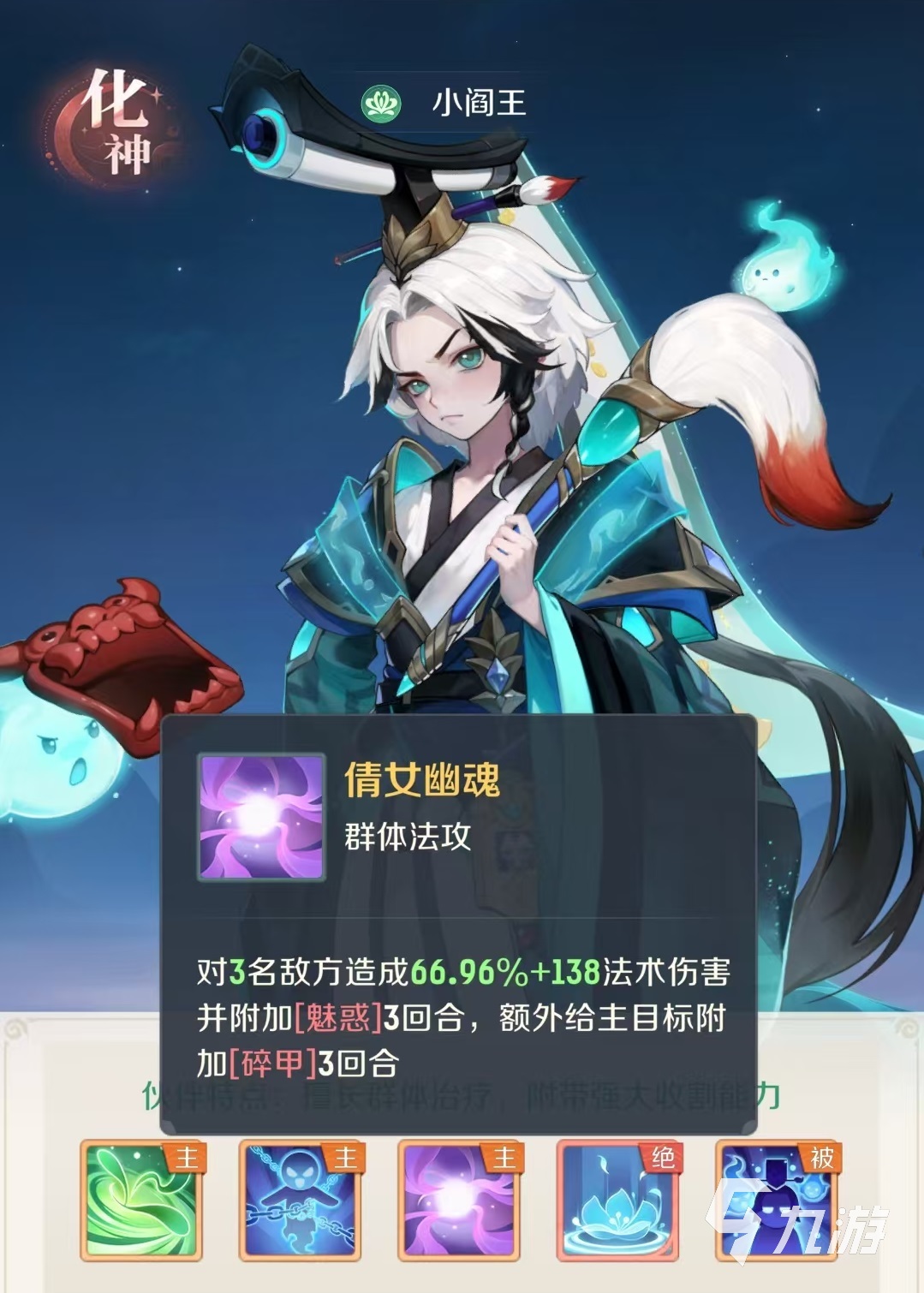自身還有一個大招水月鏡花,為5名己方目標恢復(fù)大量血量,同時召喚出一只花靈,花靈將會在每回合自動釋放治療技能,被動效果是敵方陣營每有單位倒地,小閻王就可以獲得一層魂魄狀態(tài),當(dāng)魂魄達到5層時,每回合都可以釋放一次冥罰斷魂。小閻王可以說是將傷害、治療和控制集中到了一起,是非常全能的伙伴,而且在治療和傷害等方面都非常突出,是小編強烈建議大家獲取的伙伴之一。