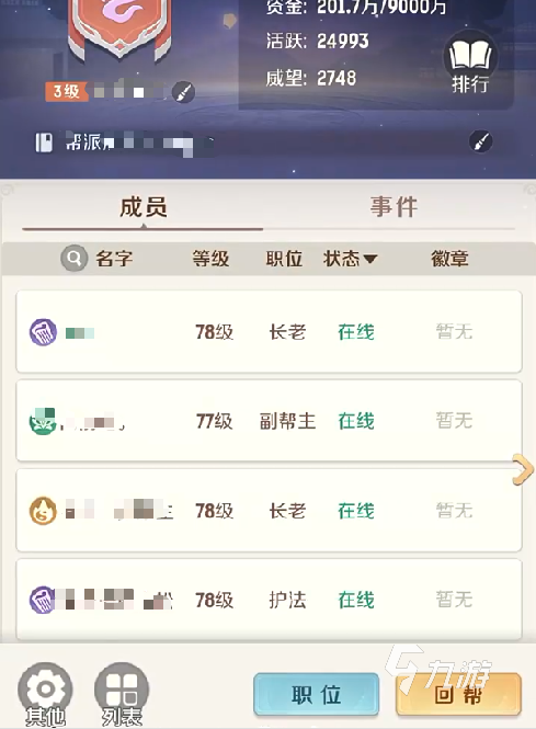 該玩法由一些重點(diǎn)的方面構(gòu)成,周活躍、拍賣、密藏海分紅、寶庫、幫派鎮(zhèn)獸、幫派迷陣、以及每日任務(wù)。幫派組織會設(shè)置有1個幫主,2個副幫主,3個長老,4個護(hù)法,6洛神,6精英,幫派的組織架構(gòu)還是非常清晰明確的。
