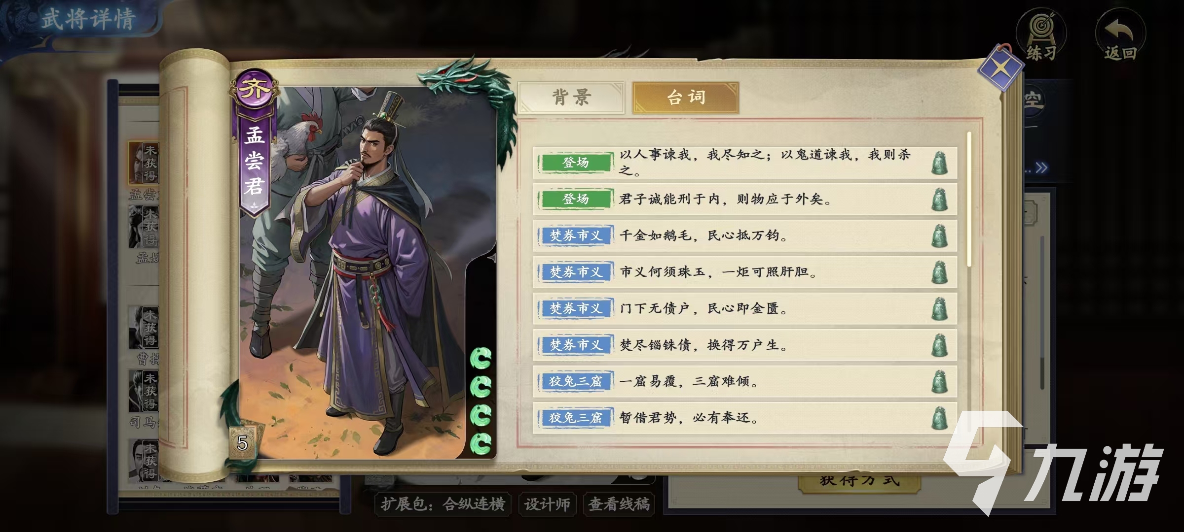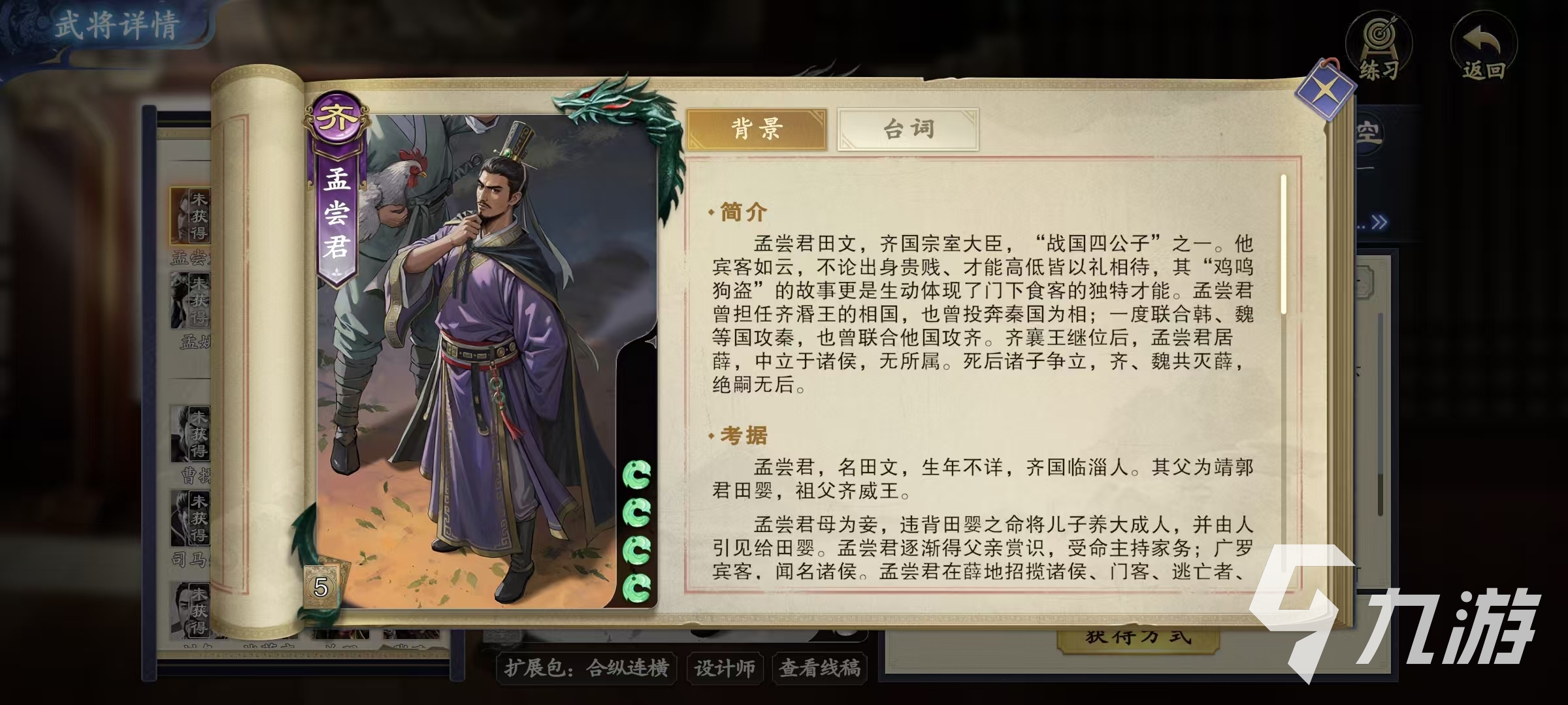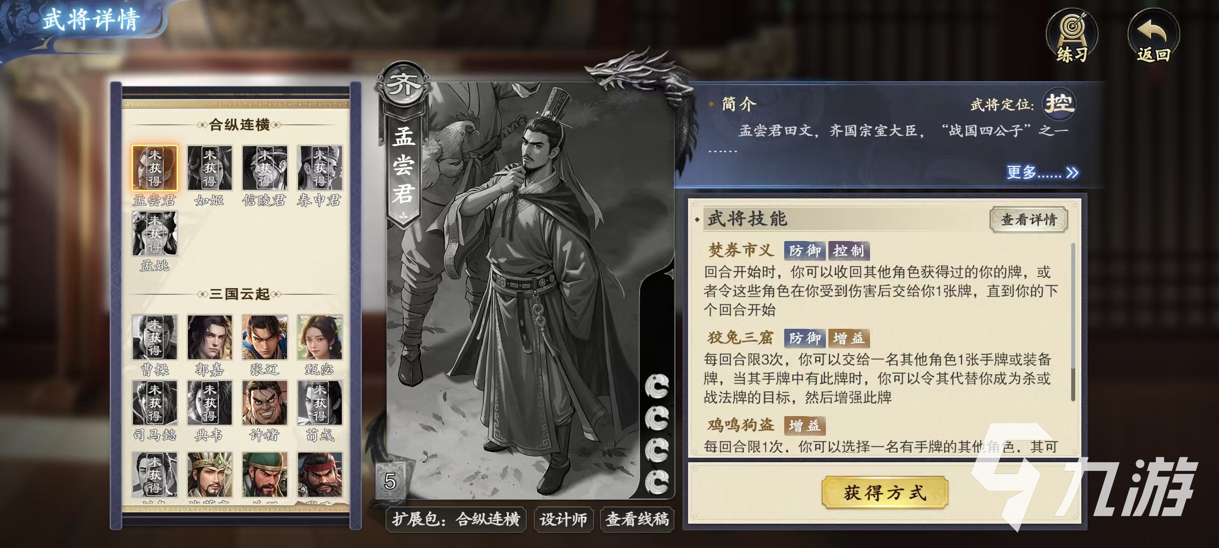 孟嘗君是屬于游戲合縱連橫擴展包的一張武將卡牌,可以在商店中通過碎銀子購買的方式直接得到。他的技能有三個,分別是焚券市義、狡兔三窟和雞鳴狗盜。第1個焚券市義技能屬于控制和防御效果,在回合開始時,可以將其他角色獲得過的孟嘗君的牌收回,或者利用這些角色在孟嘗君受到傷害后交給我方一張牌,直到下一個回合開始。