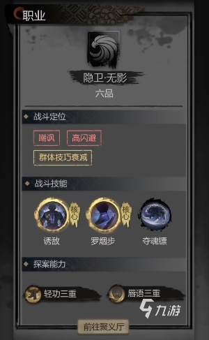 游戲中玩家招募俠士的方式就是通過【聚義堂】里的俠士招募,每次刷新能在界面上看到當(dāng)下聚義堂等級上能招募到的各類職業(yè)角色,想要招募出隱衛(wèi)這個職業(yè)的話,關(guān)鍵在于聚義堂的等級,等級越高能招募的職業(yè)越高級,品質(zhì)也越高階。