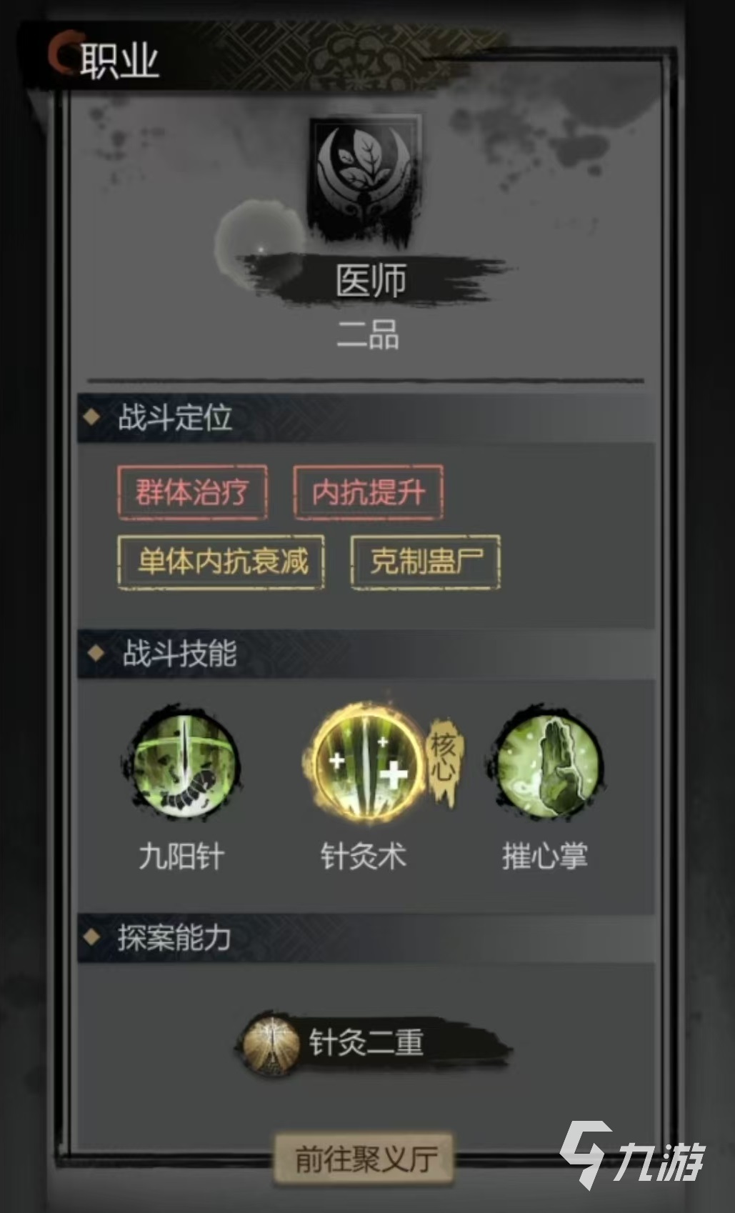 醫(yī)師屬于藥師轉(zhuǎn)職而來的二品職業(yè),后續(xù)還可以轉(zhuǎn)職成四品醫(yī)師,但是在技能效果方面是非常接近的。醫(yī)師在戰(zhàn)斗中具有群體治療、內(nèi)抗提升、單體內(nèi)抗衰減和克制蠱尸等一系列優(yōu)勢(shì)。戰(zhàn)斗技能主要包括九陽針、針灸術(shù)和催心掌。核心技能是針灸術(shù),另外它還具有針灸二重的探案能力,在需要針灸的場合下有著出色的應(yīng)用。