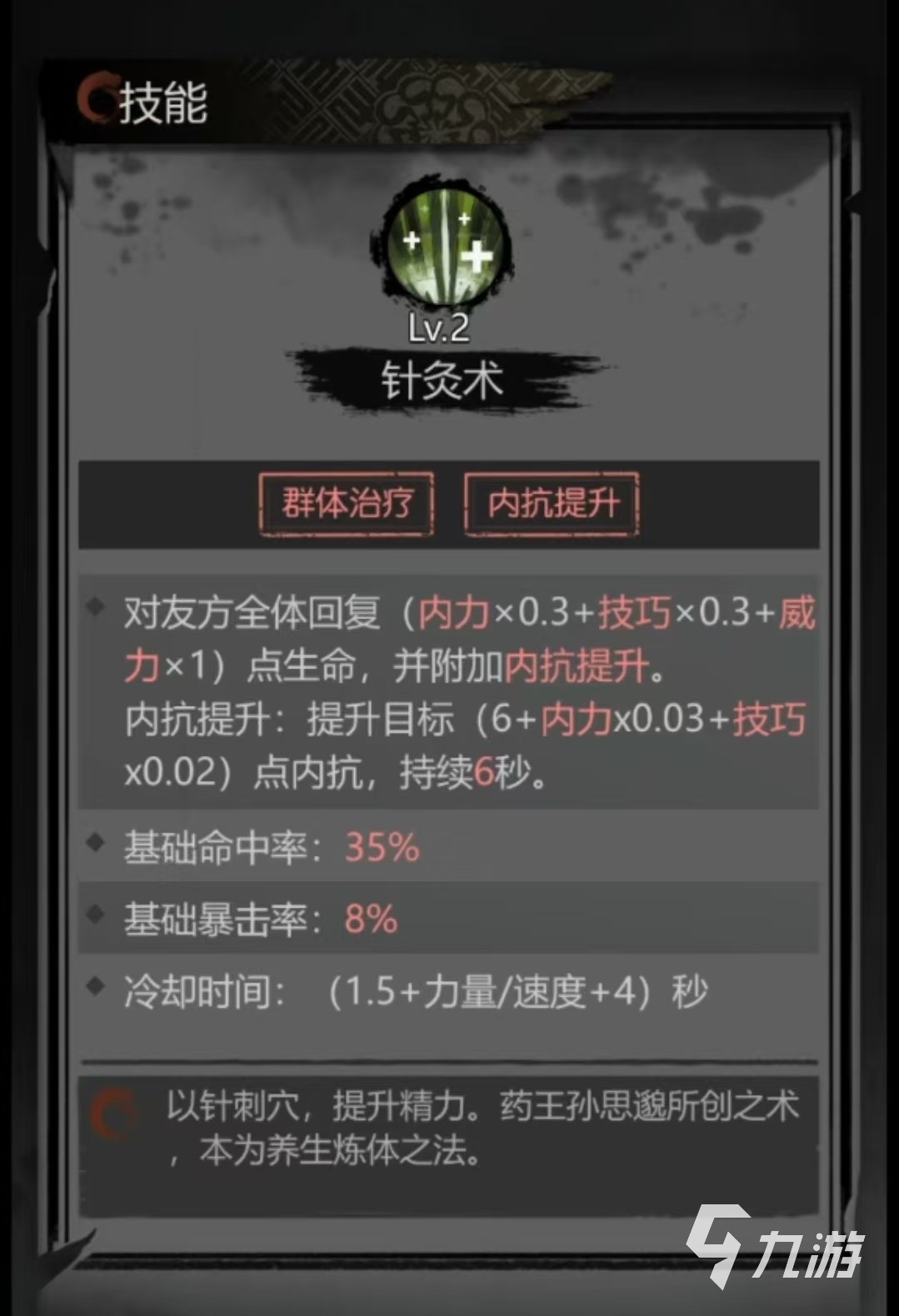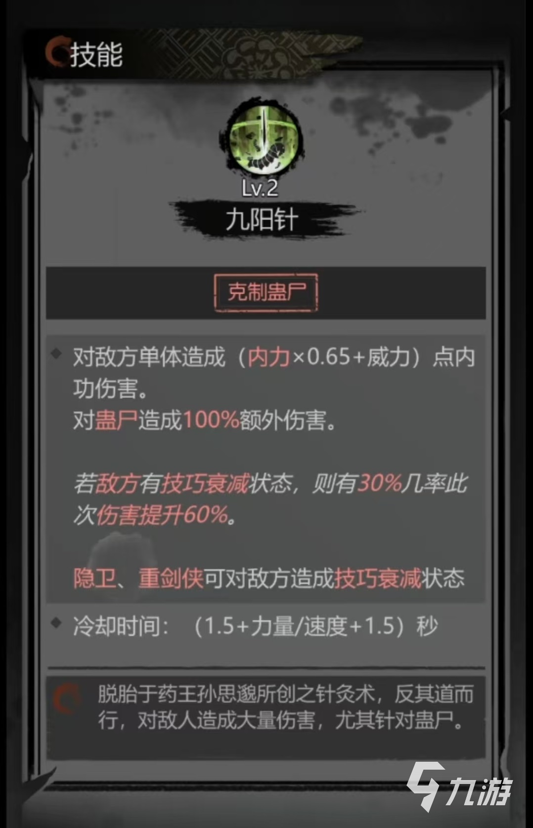 九陽針是屬于克制蠱尸類型的技能,可對(duì)敵方單體造成內(nèi)功傷害,對(duì)蠱尸有額外100%的傷害加成。如果對(duì)方身上帶有技巧衰減狀態(tài),則有幾率使此次傷害提升60%,隱衛(wèi)和重劍俠這兩個(gè)職業(yè)可以對(duì)敵方造成技巧衰減,在搭配的時(shí)候可以利用這一點(diǎn)。針灸術(shù)具有群體治療和內(nèi)抗提升這兩大核心優(yōu)勢(shì),對(duì)于己方全體目標(biāo)恢復(fù)生命值。并附加內(nèi)抗提升。內(nèi)抗提升效果可提高目標(biāo)的內(nèi)抗,持續(xù)6秒鐘,這樣在對(duì)付內(nèi)功輸出比較強(qiáng)的敵人時(shí),就有著不可替代的作用。