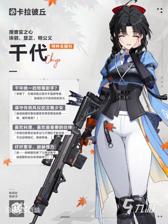 先了解下她的武器”楓鳴”,這是一把精確射手步槍,裝配的事全威力步槍彈,具有較強的戰(zhàn)斗型,能夠適應(yīng)全天候的戰(zhàn)斗,配備了1.5倍的瞄準(zhǔn)鏡,能在半自動設(shè)計模式與全自動設(shè)計模式之間切換。