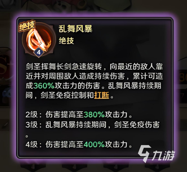 第三個(gè)要介紹的是很多陣容都會(huì)帶的一個(gè)物理輸出——?jiǎng)κ?。這個(gè)英雄可以說是遠(yuǎn)征傳說中,強(qiáng)度非常高的英雄之一,而劍圣強(qiáng)度的關(guān)鍵就在于它的技能。它的技能亂舞風(fēng)暴可以無視對手的控制,不斷靠近對手的同時(shí)造成高額的范圍傷害,而且其覆蓋范圍非常大。同時(shí)它另一個(gè)技能可以創(chuàng)造一個(gè)分身,為自己吸收傷害。劍圣這個(gè)英雄稱得上能抗能打,同時(shí)還不怕控制,因此是很多陣容必帶的一個(gè)物理輸出。