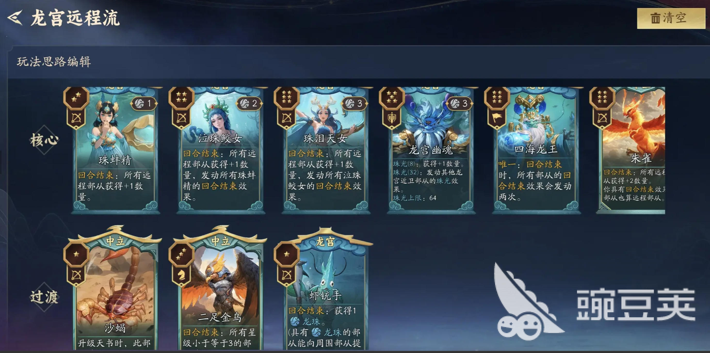 龍宮陣容的關(guān)鍵在于三張卡牌,也就是被稱為“三姐妹”的珠蚌精、泣珠鮫女和珠淚天女。珠蚌精是最基礎(chǔ)的成長引擎,在每個回合結(jié)束時都能讓遠(yuǎn)程部從增加數(shù)量。泣珠鮫女則會在觸發(fā)時讓所有珠蚌精的效果再次生效,也就是說場上的珠蚌精越多,疊加速度就越快。珠淚天女則是把這個連鎖進(jìn)一步放大,她能夠觸發(fā)所有泣珠鮫女的效果。等到這三張卡牌湊齊后,每個回合結(jié)束都能打出爆炸般的數(shù)量增長,而如果再加入四海龍王,就能把所有回合結(jié)束的效果觸發(fā)兩次,等于直接把成長速度翻倍。