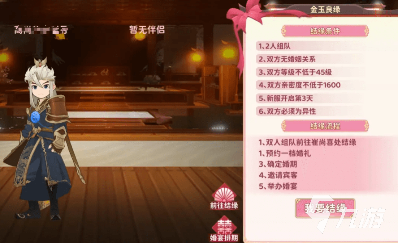 當少俠們等級到45級時就會開啟結(jié)緣系統(tǒng),大家需要滿足雙方無婚約、親密度大于1600,開服滿3天、2人組隊且雙方均為異性這幾大前提條件,滿足條件后雙方就可以前往崔尚喜處直接進行結(jié)緣。