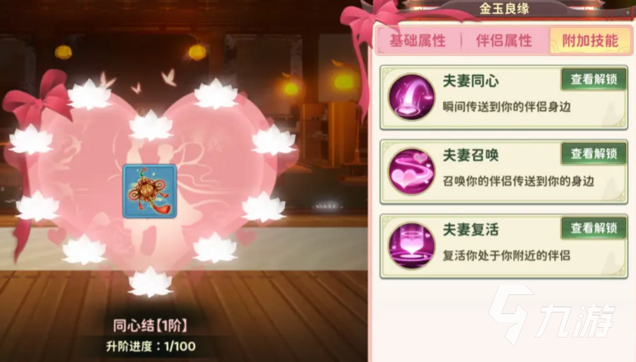 順利結(jié)婚后雙方將獲取特殊的同心結(jié),同心結(jié)將包含基礎(chǔ)屬性、伴侶屬性以及技能這3條養(yǎng)成路線,首先是基礎(chǔ)屬性,解鎖同心結(jié)后和伴侶將一起獲得基礎(chǔ)屬性的加成,用良緣簽可以進行提升,并讓獲取到的屬性顯著增強。