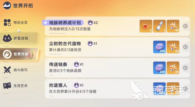 3、完成【世界探索】任務(wù)。通過這個(gè)方式來獲得輝石類似于成就的玩法,在這個(gè)板塊上只要達(dá)成要求即可獲得相應(yīng)數(shù)量的輝石,輝石數(shù)量在20-40之間。