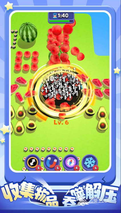 在挑戰(zhàn)結(jié)束之后,會根據(jù)玩家收集到的物品數(shù)量,給出對應(yīng)的分數(shù),分數(shù)達到了一定的數(shù)量之后,就可以開啟新的模式挑戰(zhàn),在這個新的模式下,關(guān)卡里仍然會有大量不同種類的物品。除了限定時間之外,還會規(guī)定在當(dāng)前關(guān)卡需要收集的物品種類,要完成挑戰(zhàn)就需要精準(zhǔn)的去收集物品,為了更好的達成目的,玩家可以合理利用游戲里的道具,比如在收集的過程中能讓黑洞的吸力更大,也可以直接讓黑洞的直徑變大變小,這樣物品的收集就會更簡單一些。