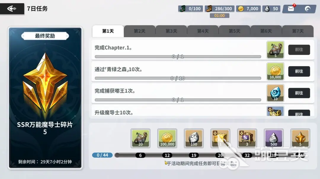 接下來(lái)在繼續(xù)推動(dòng)劇情進(jìn)程后就能夠把活動(dòng)板塊給解鎖了,活動(dòng)板塊中給玩家提供了7日任務(wù)和主線任務(wù)獎(jiǎng)勵(lì)活動(dòng)兩個(gè)方面,這兩個(gè)任務(wù)板塊都能夠讓玩家領(lǐng)取到豐厚的獎(jiǎng)勵(lì),完成活動(dòng)時(shí),七日任務(wù)大家一定要及時(shí)的完成,這里給玩家準(zhǔn)備的獎(jiǎng)勵(lì)實(shí)在時(shí)太豐厚了,不僅有黑水晶和抽卡資源,把最終任務(wù)給完成以后還能夠獲得ssr萬(wàn)能碎片5個(gè),主線任務(wù)獎(jiǎng)勵(lì)的話,大家每把1個(gè)章節(jié)的任務(wù)給完成就能獲得黑水晶1000個(gè)哦。