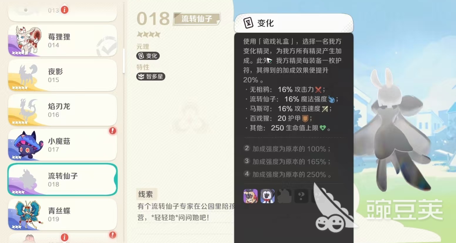 變化這個(gè)原理效果是能夠使用詭計(jì)禮盒,選擇一個(gè)我方變化精靈,為我方所有的精靈都產(chǎn)生加成,另外我方精靈每裝備一枚護(hù)符,其得到的加成效果便能夠提升20%。這里注意護(hù)符指的是大家選擇不同心像之后帶來(lái)的不同加成,這和心像的選擇。目前所有具有變化原理的精靈主要包括無(wú)相鴉、流轉(zhuǎn)仙子、馬斯可、百戲猩這幾個(gè)。其中無(wú)相鴉的額外作用是16%的攻擊力加成,流轉(zhuǎn)仙子帶來(lái)的是16%魔法強(qiáng)度加成,馬斯可是16%攻擊速度加成,百戲猩是20點(diǎn)護(hù)甲值。這幾個(gè)精靈就可以同時(shí)出戰(zhàn),這樣就能夠獲得較強(qiáng)的羈絆效果,只需要4羈絆就能夠使加成強(qiáng)度變?yōu)樵镜?50%,既容易達(dá)成,這些精靈的強(qiáng)度又比較高,很適合大家去選擇。