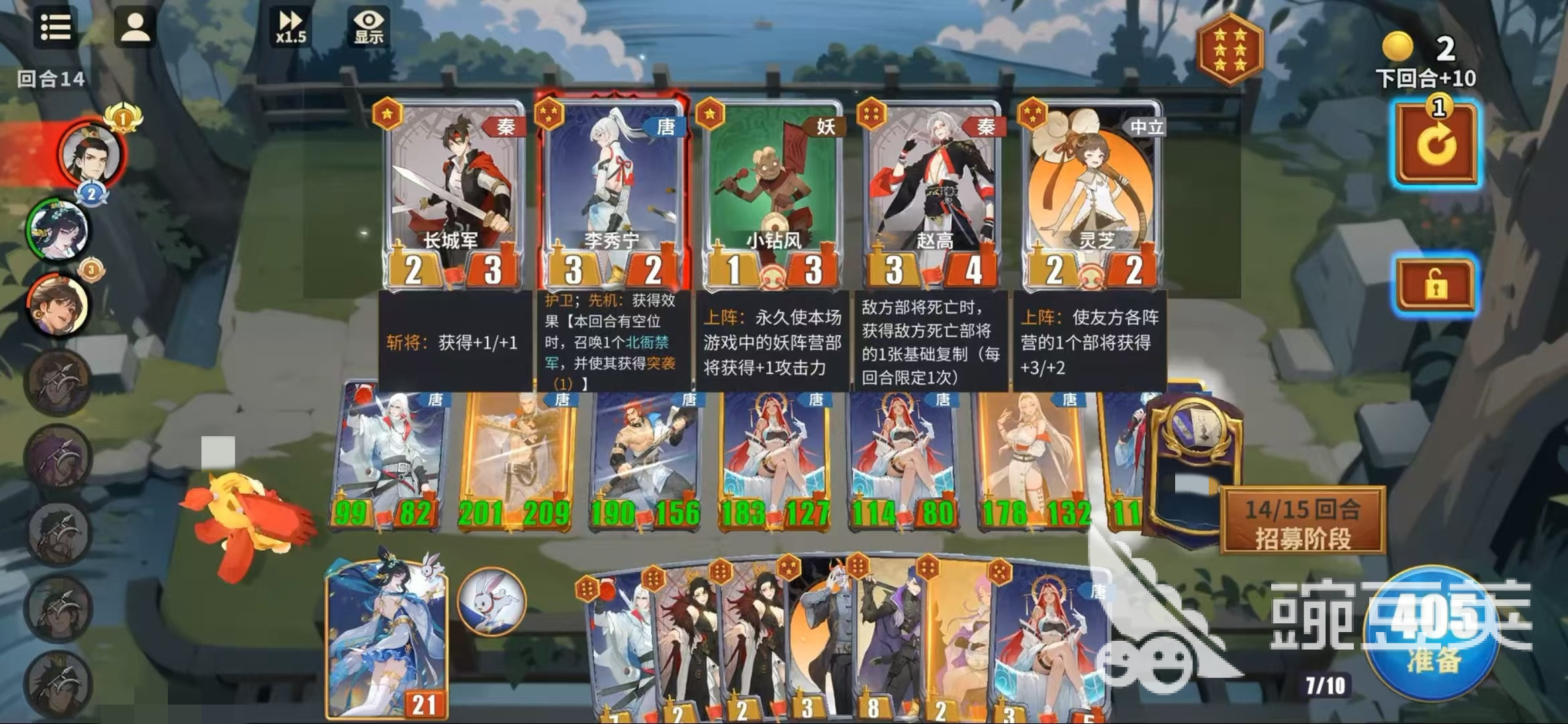 在實(shí)戰(zhàn)中的運(yùn)營(yíng)方面,前期可以使用魚(yú)玄機(jī),配合上北衙禁軍作為過(guò)渡使用。在4回合升級(jí)到三級(jí)商店之后,可以購(gòu)買到程咬金,為了搭配起來(lái)組合回血,程咬金可以和長(zhǎng)孫無(wú)忌一起。中期優(yōu)先將商店升到5級(jí),在此期間應(yīng)該盡量減少刷新次數(shù),如果遇到李秀寧、楊玉環(huán)等卡牌,可酌情購(gòu)買。商店升到5級(jí)后,適當(dāng)?shù)娜ニ⑸瞎偻駜汉颓丨?。后期主要就是以李白或者麒麟為主力?gòu)建陣容,通過(guò)禁軍的高頻次來(lái)觸發(fā)武則天的鼓舞,形成一套良好的循環(huán),快速輸出消滅對(duì)方。后期的畢業(yè)陣容就是李白、武則天、秦瓊、楊玉環(huán)、李秀寧等。