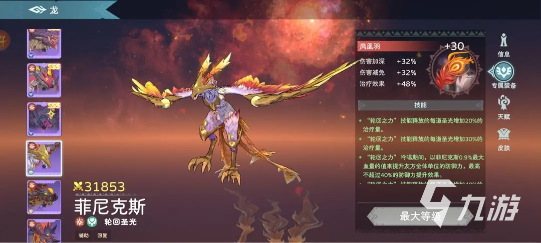 通過技能效果可以看出,3技能保證了它的攻擊力和生存能力,而12技能帶來的奶量還是相當(dāng)可觀的,能保證隊(duì)伍整體的生存能力??膳鋫鋵傺b備鳳凰羽,能提高治療效果,并增加全體隊(duì)友防御力。